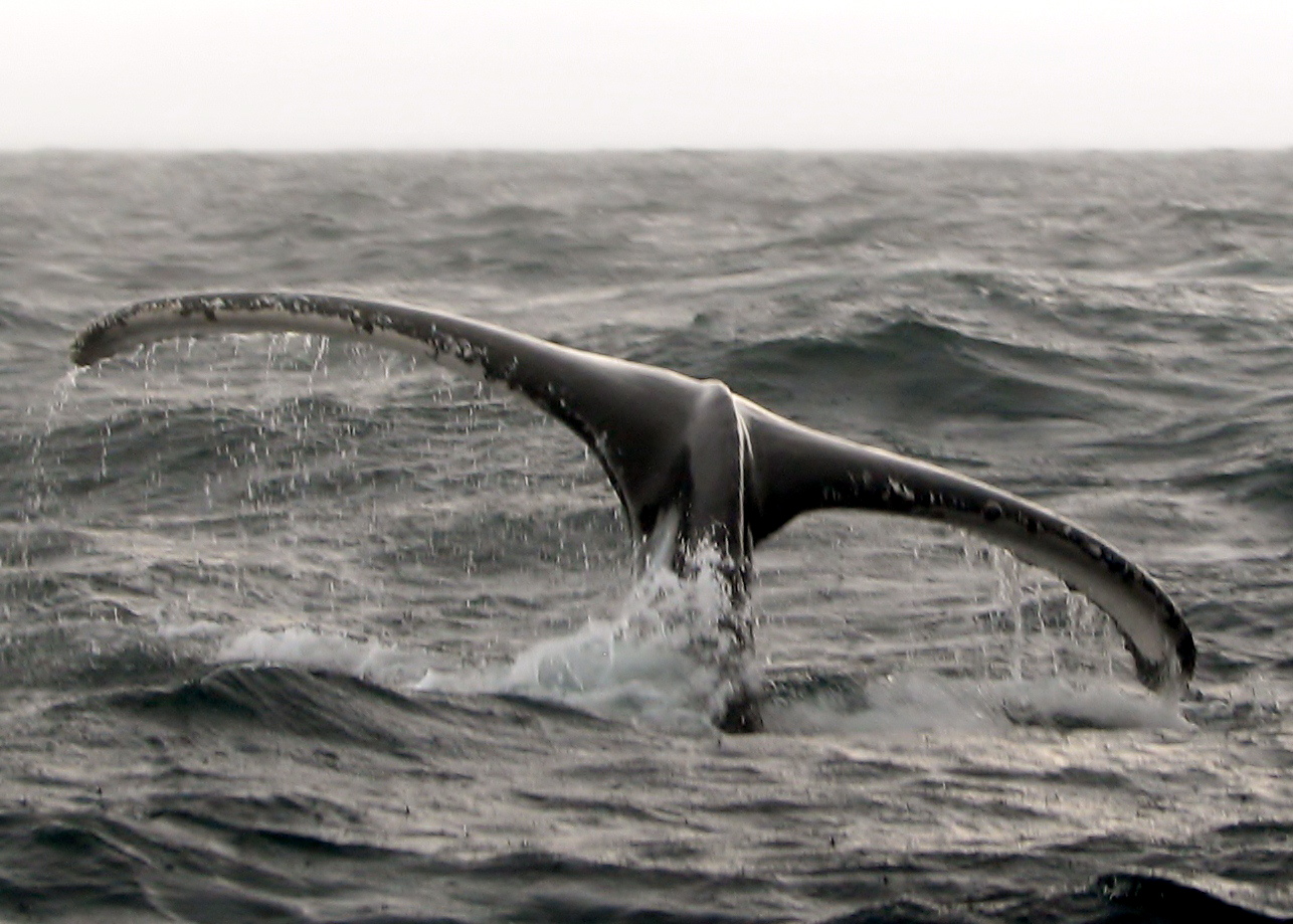 Having stared, wonder-struck, for a while, you think you must try to capture these moments – for Facebook mates in Europe at the very least – and, while hanging on with one hand, you stab at your camera, producing a series of grey frames, perhaps with a trace of spout or post-breaching spray in a big seascape, but few bits of whale. Between the lot of us (12), hundreds of useless shots must have been taken during the three hours we were out in the Bay. My friend was more patient than I – and the best of these photographs are his. I gave up to gaze, again, but he was determined to catch a tail fluke in all its glory and some breaching action.