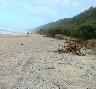 Following a couple of days in Rainbow Beach, we decided to return to Brisbane via Teewah Beach and the Tewantin ferry across the Noosa River. We accessed the beach along Freshwater Road from Rainbow Beach Road, and a most pleasant drive through the forest it was. But the beach looked vastly different from previous visits. Extensive mounds of pumice lay along virtually the whole of its 40 kilometres; there were large amounts of other debris ranging from small bits of plastic in a rainbow of colours to lengths of string to thongs, wooden flotsam and larger pieces of plastic. All in all, it wasn't pretty. Scum was the word that came to mind. On my beautiful Cooloola.